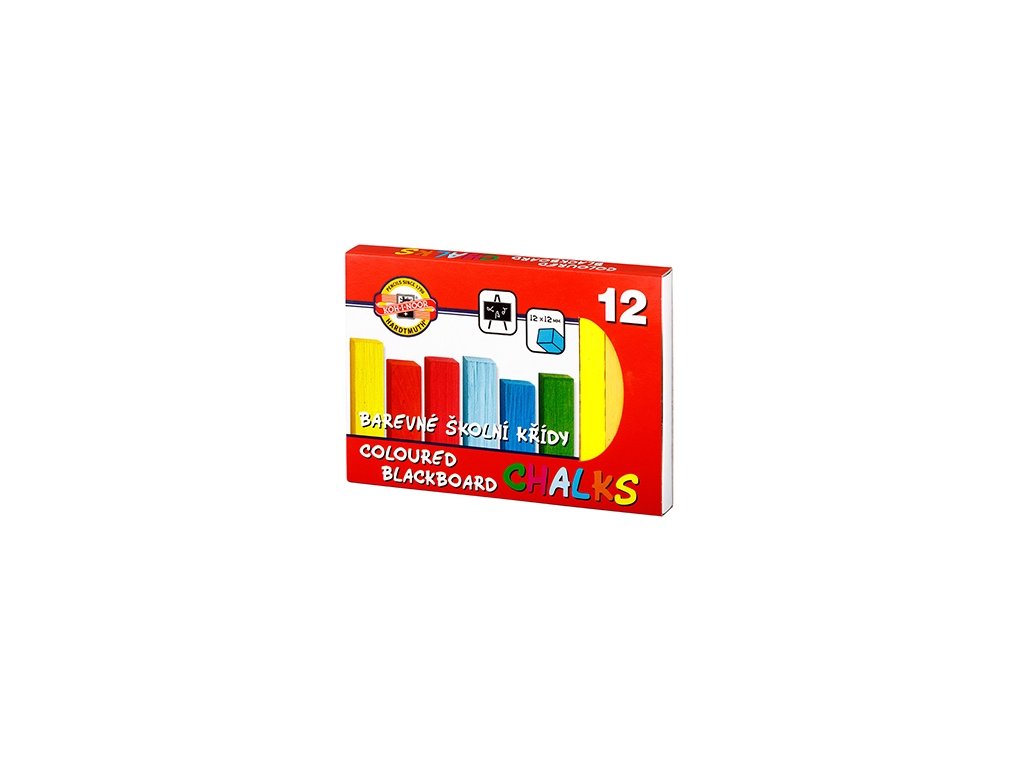 Sada 12 kusov štvorcovej farebnej kriedy 12 x 12 x 100 mm, určená na písanie na tabuľu, vložená do škatule s potlačou.