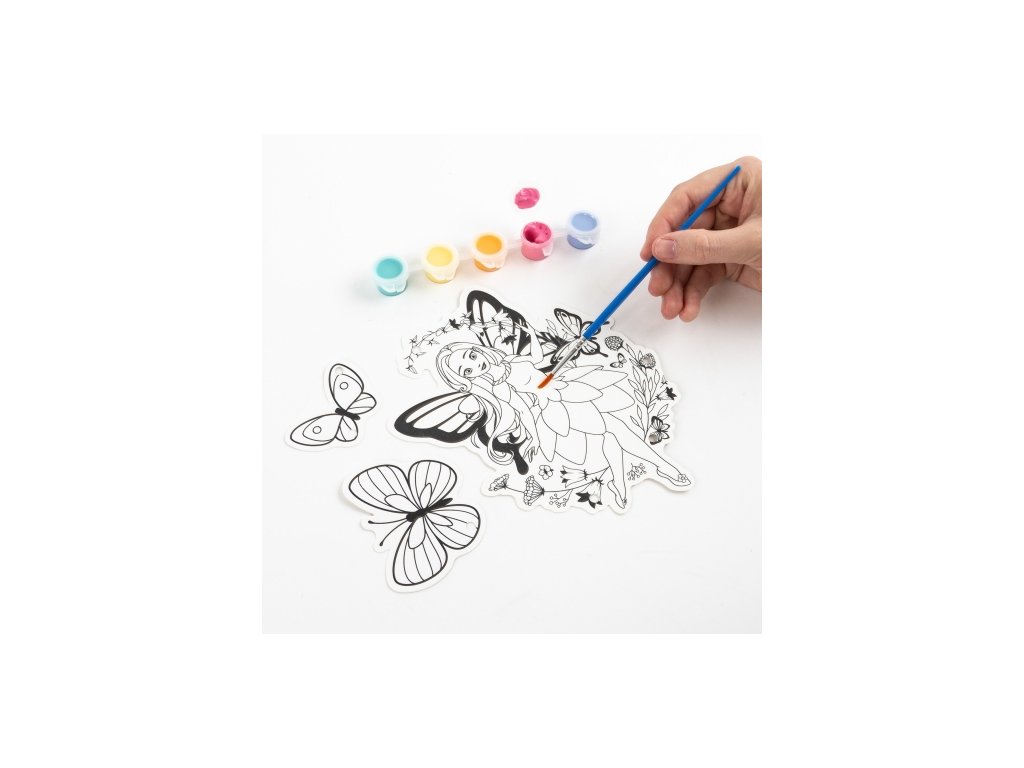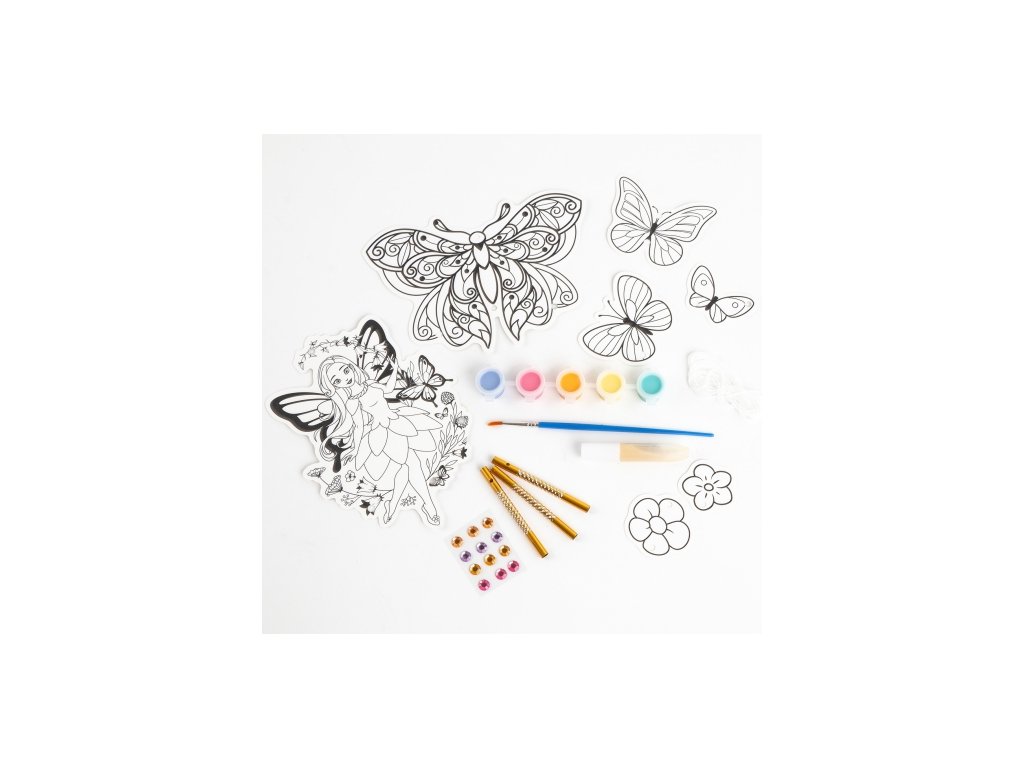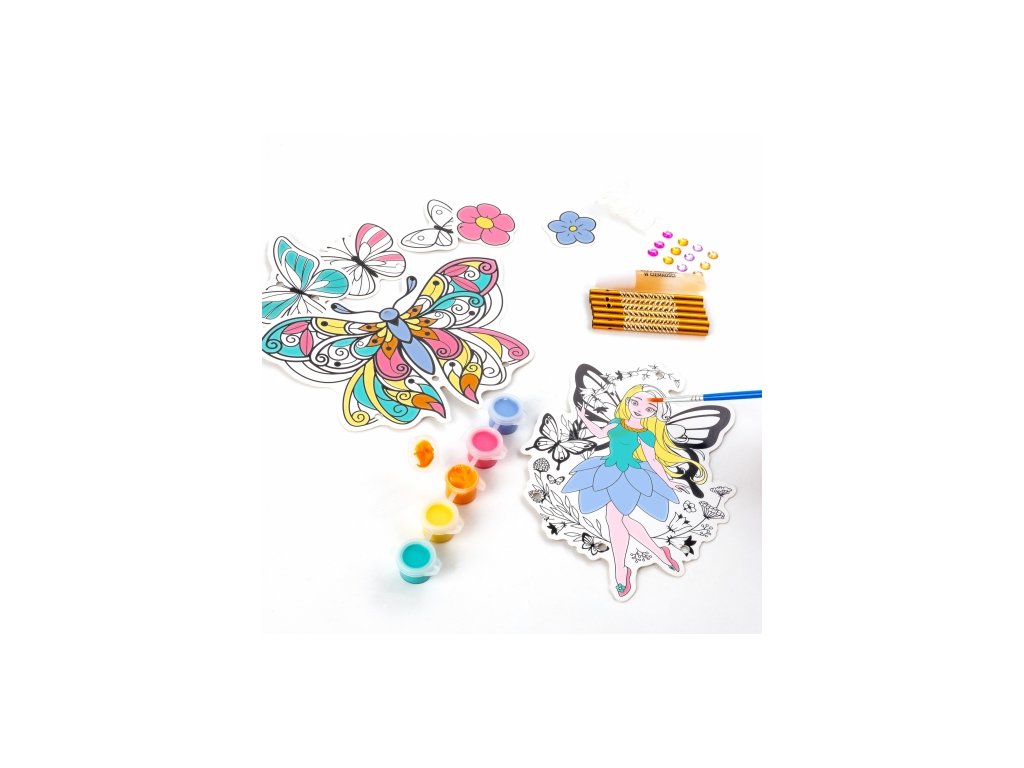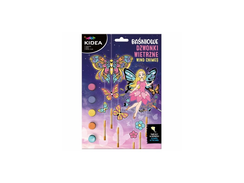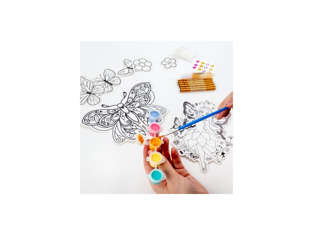 Kompletná kreatívna sada obsahuje 6 zvonkohier, 12 ozdobných diamantov, 7 kartónových šablón na maľovanie, 5 farieb so štetcom, gél svietiaci v tme a šnúrku na montáž.