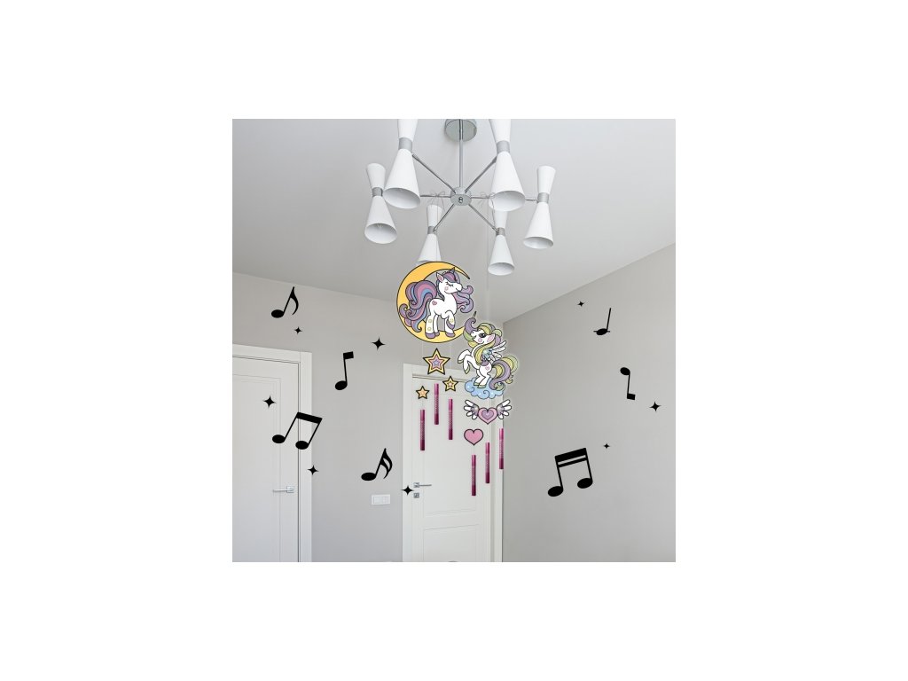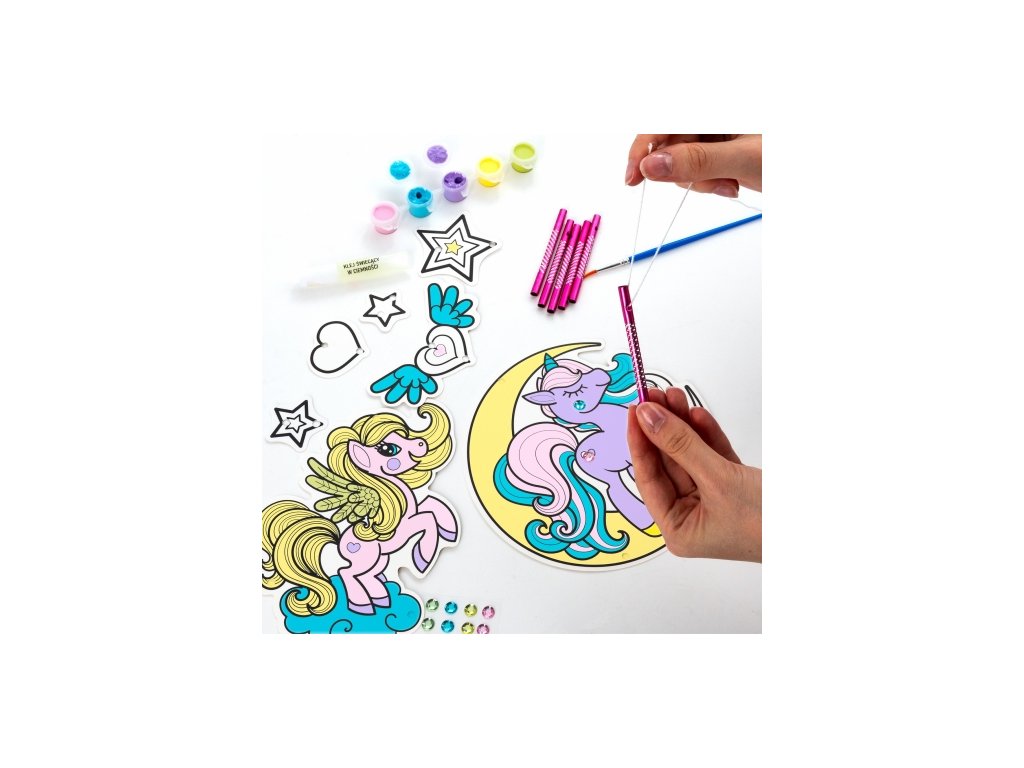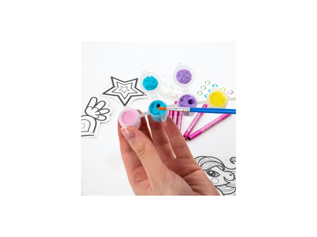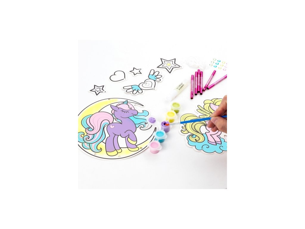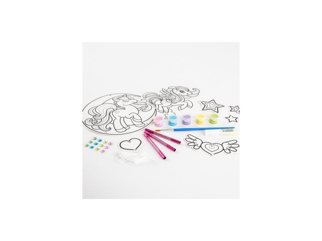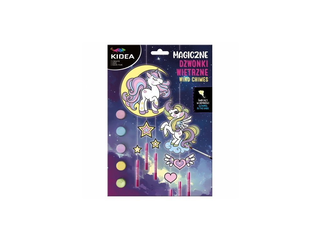 Kompletná kreatívna sada obsahuje 6 zvonkohier, 12 ozdobných diamantov, 7 kartónových šablón na maľovanie, 5 farieb so štetcom, gél svietiaci v tme a šnúrku na montáž.