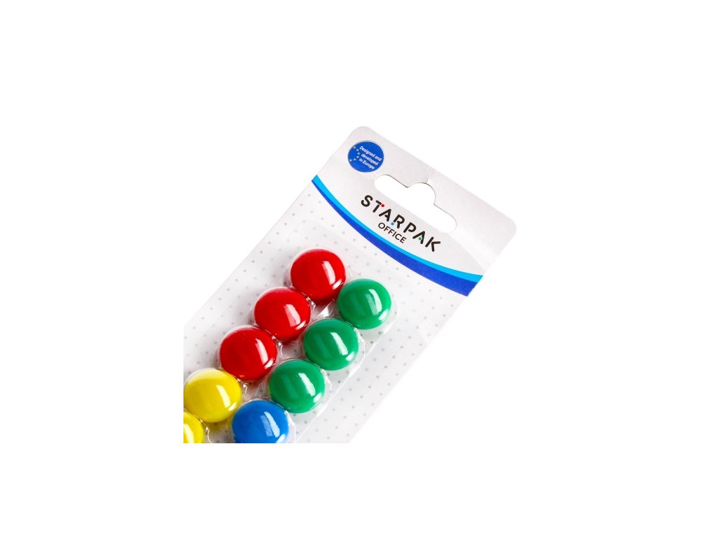 Sada silných magnetov v plastovom obale v štyroch farbách: červená, zelená, žltá, modrá s priemerom 22 mm. Užitočné v kancelárii, doma a v práci. Pozrite si aj ďalšie produkty STARPAK do kancelárie. Magnety balené v blistri po 12 kusov.Vyrobené z plastu. Výrobok je určený pre deti vo veku: 3+. Rozmery produktu (výška x šírka) [cm] 19x8. Hmotnosť balenia (kg.) 0,05 kg