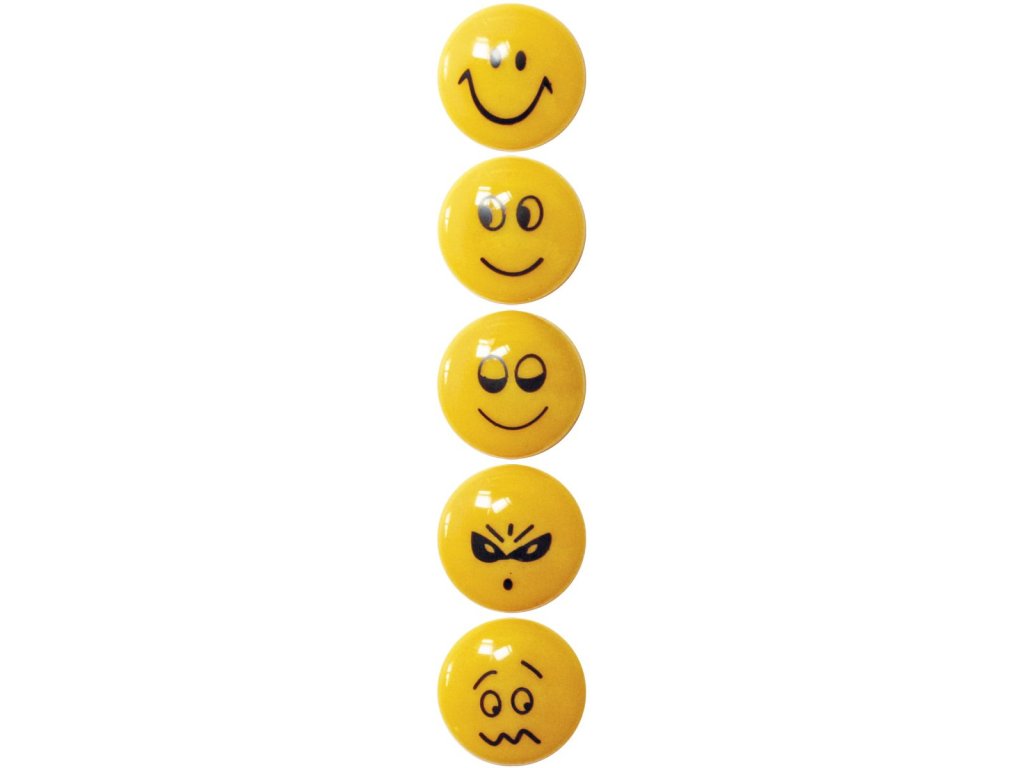 Sada magnetiek s motívom emoji. Farba: žltá. Tvar: Okrúhly. Priemer: 30 mm. Blister: 6 ks.