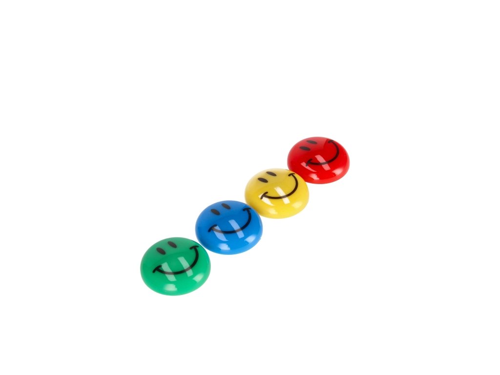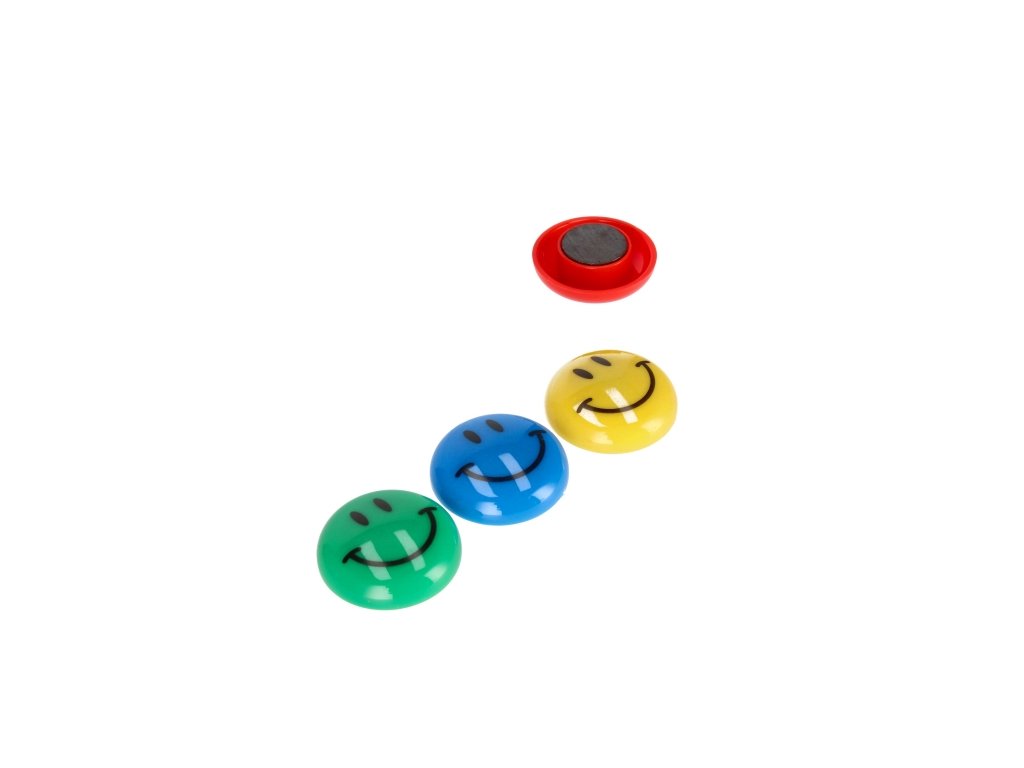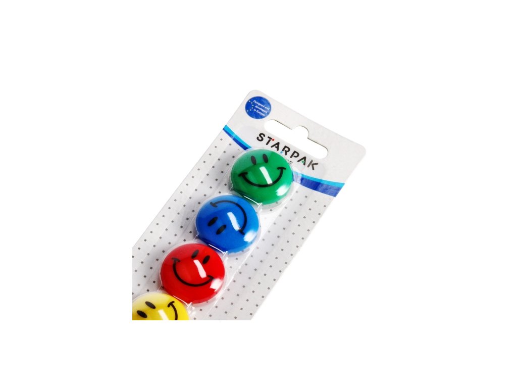 Sada silných magnetov v plastovom obale v štyroch farbách: zelená, modrá, červená, žltá s priemerom 30 mm. Každý magnet má usmiatu tvár. Užitočné v kancelárii, doma a v práci. Magnety balené v blistri po 6 ks.Vyrobené z plastu. Výrobok je určený pre deti vo veku: 3+. Rozmery balenia (výška x šírka) [cm] 23x7. Hmotnosť balenia (kg.) 0,05kg.