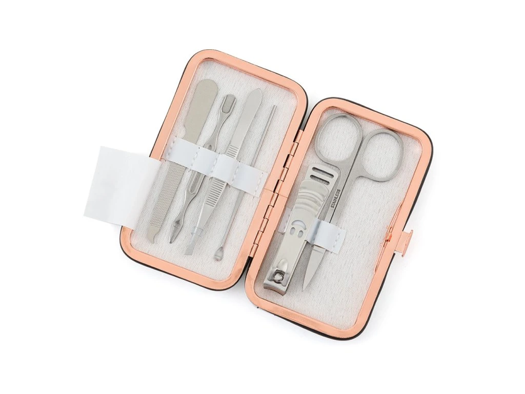 Cestovný manikúrny set 6 ks. Strieborná sada obsahuje nožnice, klieštiky na nechty, skosenú pinzetu, pilník, manikúrnu tyčinku a zatlačovač kožičky. Ideálna veľkosť do kabelky či na cesty. Rozmery: 11 x 6,5 x 1,5 cm