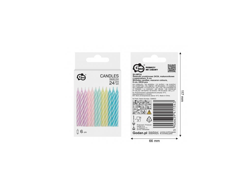 Výška: 6 cm Vzor: pruhy Farba: viacfarebná pastel Množstvo: 24 ks.