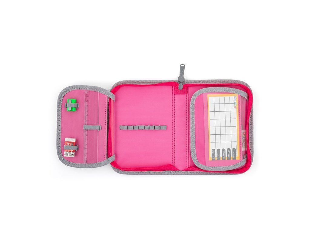 Jednoposchodový školský peračník s plyšovým efektom s 2 chlopňami, prázdny obsahuje 25 gumových pútok na uchytenie písacích potrieb. Na vnútorných chlopniach sú priehľadné fólie na rozvrh hodín.Dodatočné parametre