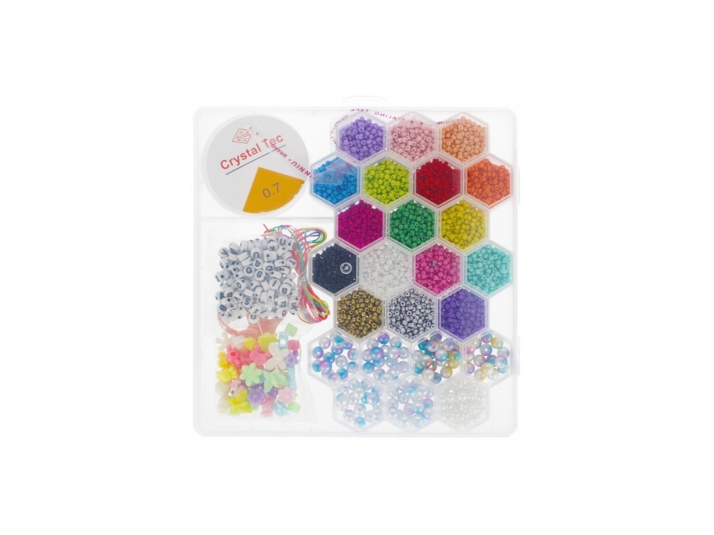 Set bude môcť každý mladý umelec rozvíjať svoje manuálne zručnosti, prebudiť fantáziu a predovšetkým sa pri tom výborne zabaviť. Spokojnosť s nosením korálok a náramkov, ktoré si sami vyrobíte, bude veľká! Sada obsahuje rôzne druhy korálok - v rôznych veľkostiach, farbách, tvaroch a textúrach. Výrobok vyrobený z plastu. Obsahuje malé časti. Rozmery/hmotnosť: Rozmery balenia (dĺžka x výška x hĺbka) [cm]: 20x2x20. Hmotnosť balenia (kg): 0,34 kg. Určené pre deti vo veku: 3+ Balené v priehľadnej plastovej krabičke.