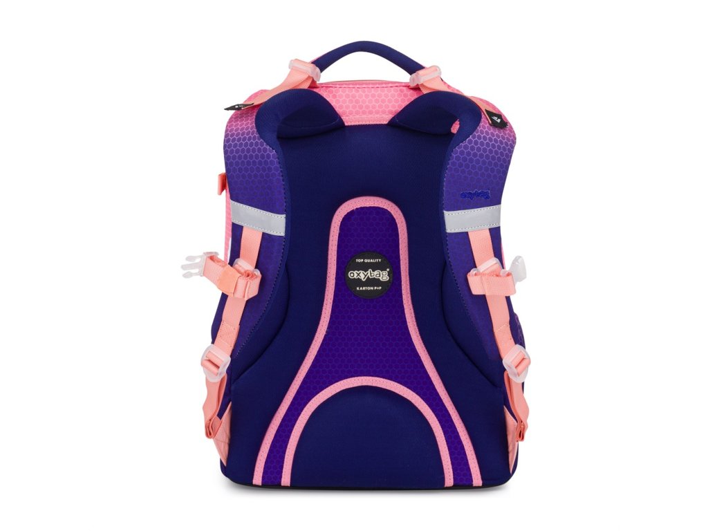 Školský batoh z radu OXY Ombre je ideálny pre školákov od 3. triedy. Moderný design v štýle ombre zaujme na prvý pohľad. Anatomicky tvarovaný chrbtový panel, polstrované ramenné popruhy a nastaviteľný hrudný popruh zaistí chrbát ako v bavlnke každému školákovi. Pevné dno zabraňuje prevrhnutiu samostatne stojaceho batohu. Batoh disponuje dvoma priestrannými vreckami na všetky potrebné školské pomôcky. V bočných postranných vreckách na gumu je priestor na fľašu na pitie, ktorá je ľahko dostupná na doplnenie pitného režimu každého školáka. Do predného vrecka sa ľahko schová menšia desiata. Nechýba rad reflexných prvkov. Batoh je vhodný pre deti vysoké od 136 cm. Dĺžka chrbtového panelu je 43 cm, objem je 28 l, hmotnosť batohu je 960 g a jeho nosnosť je 8 kg.