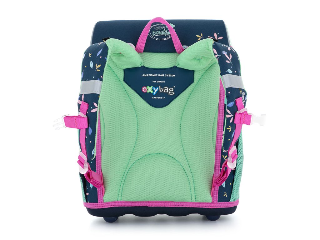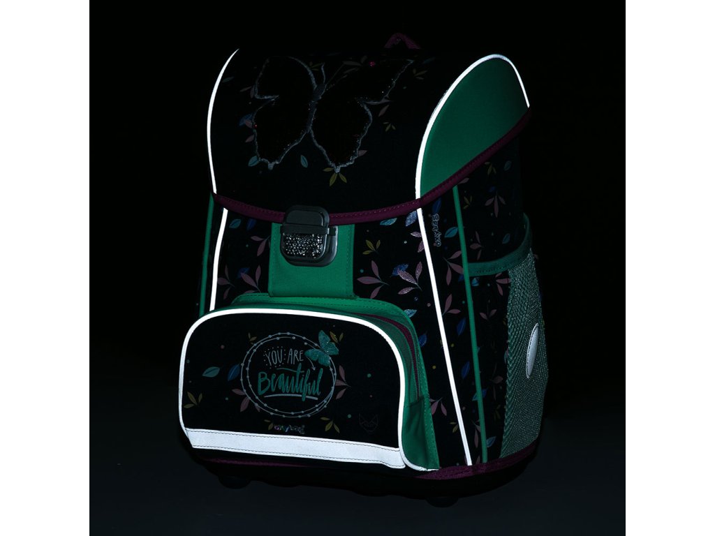 Školská aktovka z radu Premium s motívom motýľa je anatomicky tvarovaná a zaisťuje tak správne usadenie na chrbte. Vystužený chrbát a vnútorná výstuha udržujú stály tvar batohu. Polstrovanie je z príjemného priedušného materiálu, široké mäkčené popruhy sú navrhnuté tak, aby dokonale priľnuli a rovnomerne zaťažili ramená dieťaťa. Aktovka sa skladá z jednej priestrannej komory, kam sa pohodlne zmestia všetky školské pomôcky pre deti v 1. av 2. triede. Dno plecniaka je z pevného materiálu, chráni tým obsah pred prevrhnutím a vysypaním. Zapínanie je na bezpečnostnú pracku. Predné vrecko je určené na desiatu, nechýba rad reflexných prvkov, vďaka ktorým je aktovka viditeľnejšia.