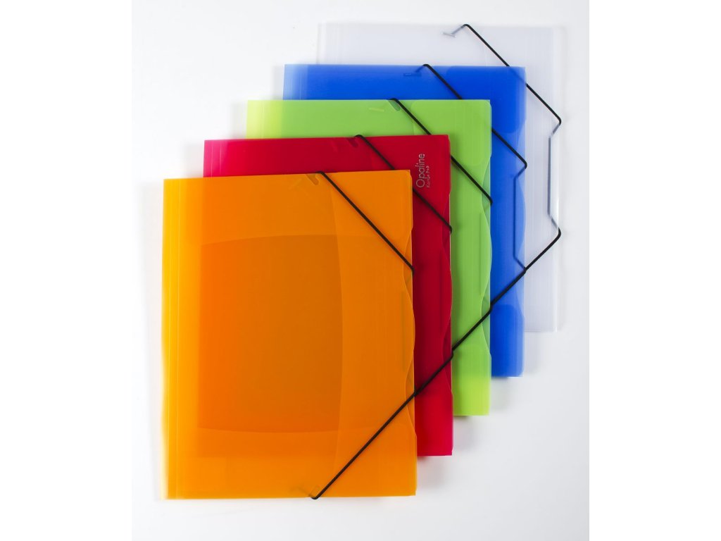Dosky s tromi chlopňami. Uzatváranie pomocou gumičky. Materiál polypropylén, sila 350 mic. Roztiahnuteľný chrbát až 3,0 cm. Kapacita 250 listov. Pre formát A4