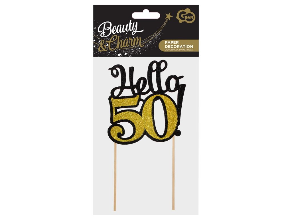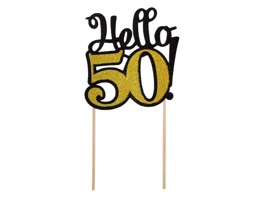 Papierová dekorácia - tortový zápich k 50. narodeninám. Elegantná čierna a trblietavé zlato v glamour štýle vytvárajú fenomenálnu kombináciu. Zápich k päťdesiatke, výročiu alebo jubileu bude na torte vyzerať krásne a poteší hostí.