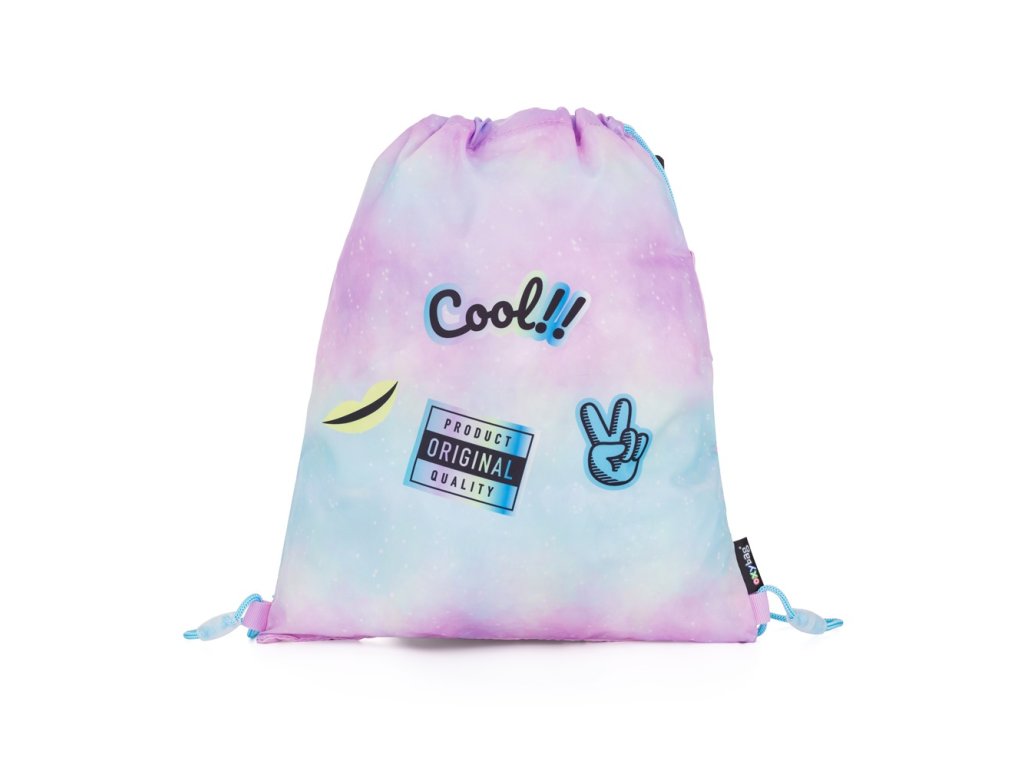 Vrecko na prezuvky. Uzatváranie stiahnutím šnúrok, možnosť nosiť aj na chrbte alebo pripevniť k školskému batohu. Materiál 100% polyester.